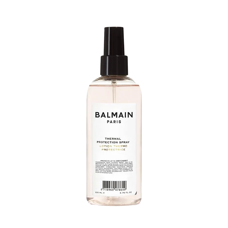 Balmain Thermal Protection Spray je lahek, izjemno fin sprej ustvari toplotno zaščito, ki ščiti lase pred vročino sušilnika za lase, likalnika ali kodralnika. Formula zagotavlja briljanten zaključek. Preprečuje izgubo vlage in povečuje sijaj.