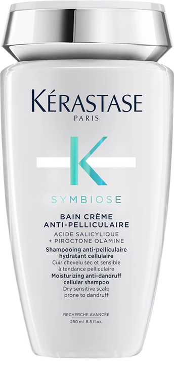 Za suho in občutljivo lasišče, nagnjeno k prhljaju, bo poskrbel vlažilni šampon Kérastase Symbiose Bain Creme Anti-Pelliculaire. S kremasto, a lahko penečo sestavo odstrani nečistoče, viden prhljaj in kožne luske, ki so prilepljene na lasišče, ne da bi izsušil lasna vlakna.